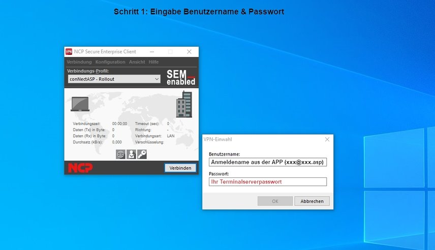 Bei der ersten Verbindung wird der conNect ASP NCP VPN-Client mit Ihren persönlichen Zugangsdaten konfiguriert.