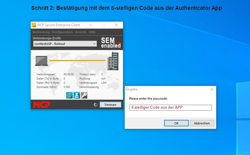 Nach der Installation benötigen Sie für den Verbindungsaufbau Ihren Benutzernamen (s. App) und Ihr Passwort des conNect ASP Systems. Anschließend werden Sie nach dem Einmal-Passcode aus der App gefragt.