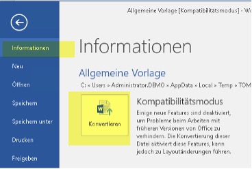 Mit Office 2010 hat Microsoft ein neues Dateiformat in den Office-Programmen eingeführt (DOCX, DOTX, XLSX u.s.w.), wovon auch die DATEV-Schriftguterstellung seit einiger Zeit profitieren kann. Dieses Verfahren beschleunigt die Dokumenterstellung wesentlich und wird zukünftig auch im Online-Bereich genutzt. Die Zeit für die alten Formate - die bisher in dem sogenannten Kompatibilitätsmodus noch unterstützt wurden - läuft langsam ab.
